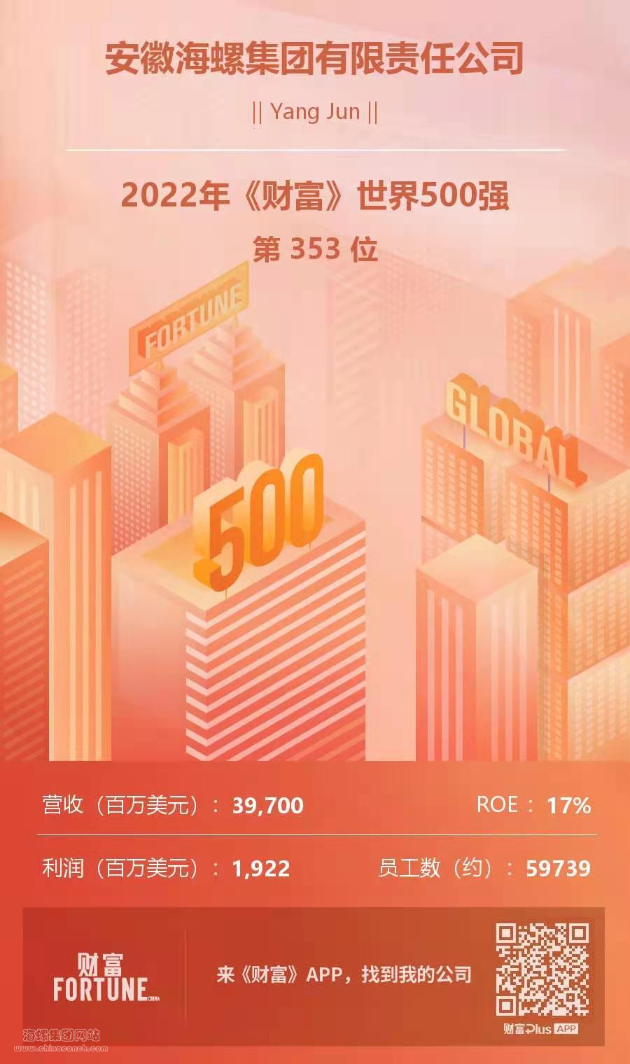 2022年8月3日,《財(cái)富》雜志公布“2022年世界500強(qiáng)企業(yè)”排名榜單,海螺集團(tuán)以39,700百萬美元的營業(yè)收入位居第353位,連續(xù)4年進(jìn)入世界500強(qiáng)。